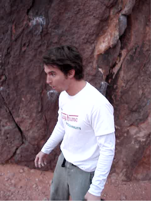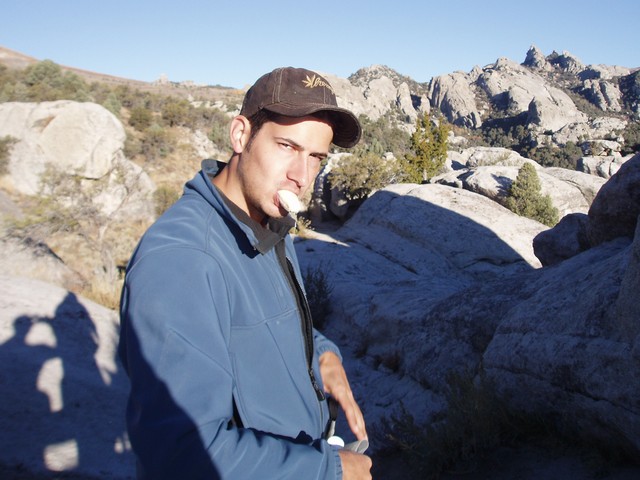 Jeff "Hempy" Hemphill enjoying a banana in the morning at City of Rocks, ID, Oct 23, 2005.