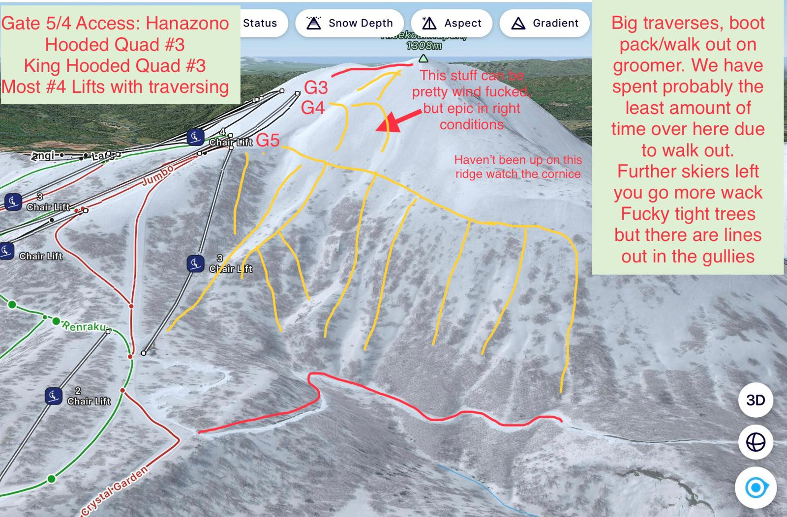 Jen skiing into a cool ravine exit along the G7 zone. See the Niseko Ski map HERE .