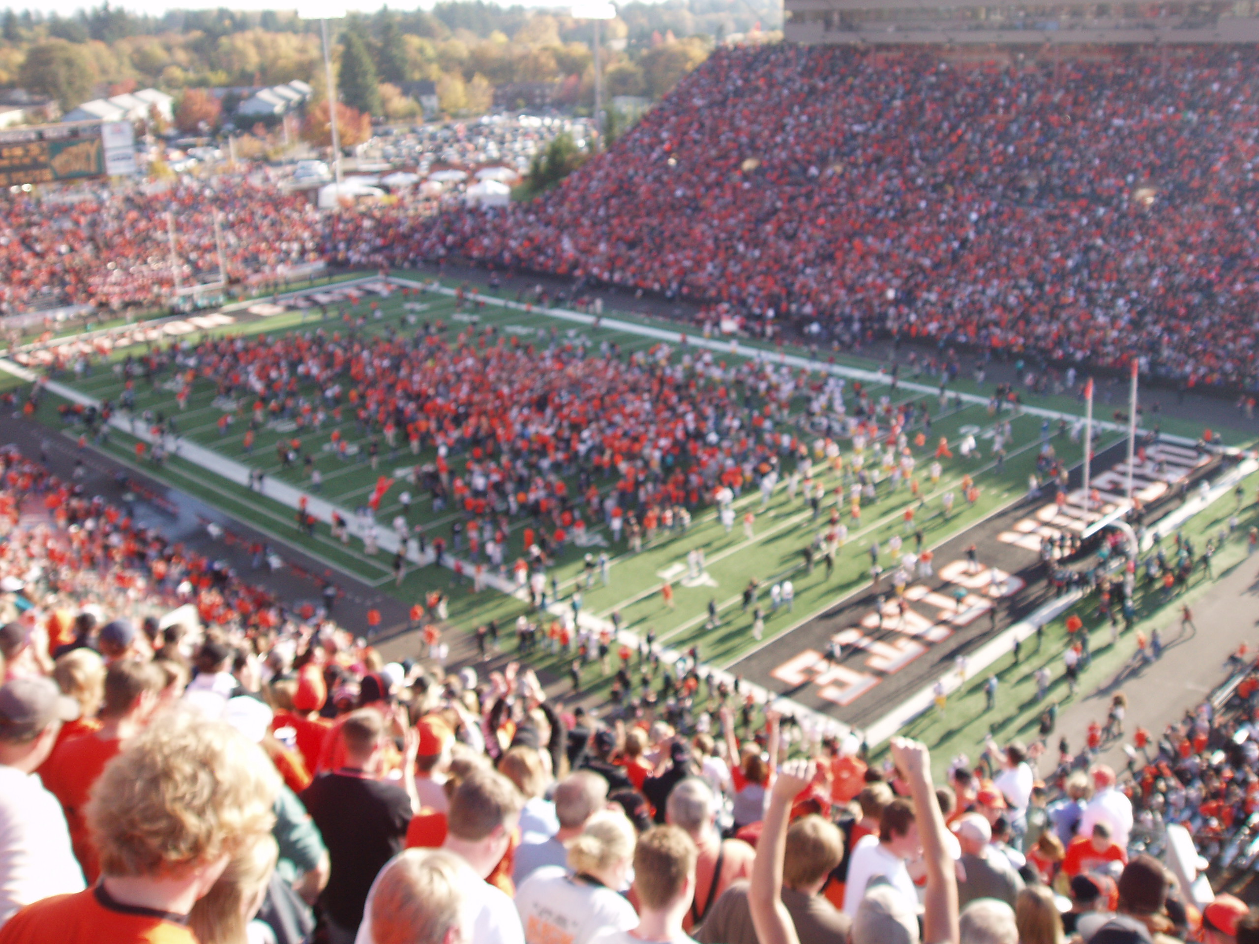 A blurry picture of the 3rd time the fans rushed the field to celebrate the OSU Beavers beating the